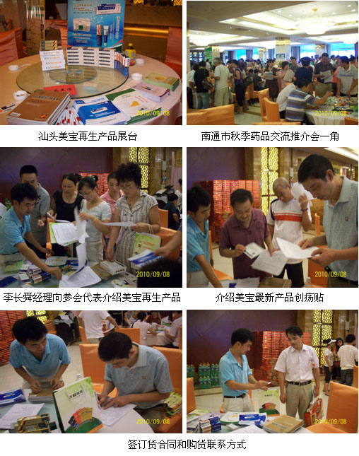2010年9月8日,南通市秋季药品展销交流推介会在南通市水天堂大酒店拉开了帷幕,参加本次会议的厂家及药业公司有200余家,其中汕头美宝制药有限公司住南通市办事处工作人员也参加了本次推介会,在会议结束前,订货美宝湿润烧伤膏2件、20g曲咪新5件、创疡贴50贴。药品展销交流推介会期间,汕头美宝制药有限公司李长舜经理和专家组杜福勤主任深入展台前与客户代表亲切交谈,详细地介绍人体再生复原科学、再生医疗技术系列产品、临床满意疗效等,倾听客户代表的意见与建议,商谈进一步合作事宜,并协调解决客户的困难与终端关系。会议超过预期效果,取得圆满成功。