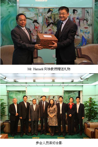 10月20日下午一点,Mr. Hamadi Widjaja一行如约来到美宝北京总部,受到了国际市场总部总经理孙霞女士及美宝团队的热情接待,随后双方展开了既定的商务会谈。孙总继往开来地总结了MEBO与Combiphar五年以来的发展历史,并向客人介绍了集团2007年以来国际市场板块的高速发展,强调美宝印尼市场现在及今后的快速发展与双方的紧密合作息息相关。Mr. Hamadi表示完全同意孙总的意见,提出美宝一直都是他们最重要的合作伙伴,作为Combiphar TOP5的独特优势产品将被列为该公司未来五年市场发展的关键点之一,提出在今后将继续加大投入,继续加强与美宝高层的深入交流,不断拓展双方的多元化合作。随后由Combiphar公司新任营销总裁Mr. Paulus汇报了未来五年的MEBO发展规划,孙总针对对方的各项计划分别提出了宝贵的意见和建议。
