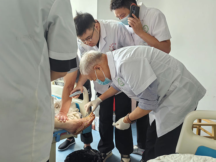 9月22日,应分宜县中医院外科主任林主任邀请,《中国烧伤创疡杂志》编委、烧伤创疡再生医疗技术临床专家金党军前往该院为一例糖尿病足下肢溃疡患者进行会诊,并亲自为患者进行清创换药,示范再生医疗技术在治疗糖尿病足的临床规范应用,获得了科室医生的高度认可。